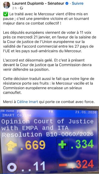 Les Députés européens viennent de voter à 11 voix près ce mercredi 21 janvier, en faveur de la saisine de la Cour de justice de l’Union Européenne sur la validité de l’Accord commercial entre les 27 pays de l’UE et les pays sud-américains du Mercosur.